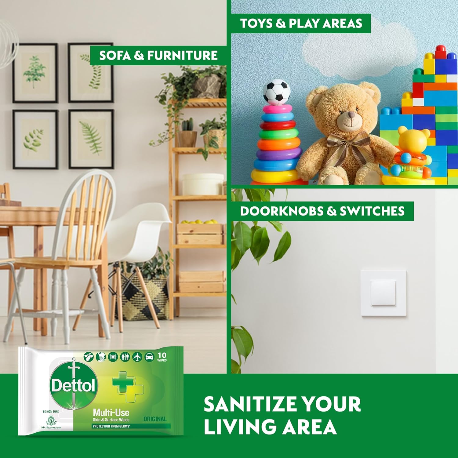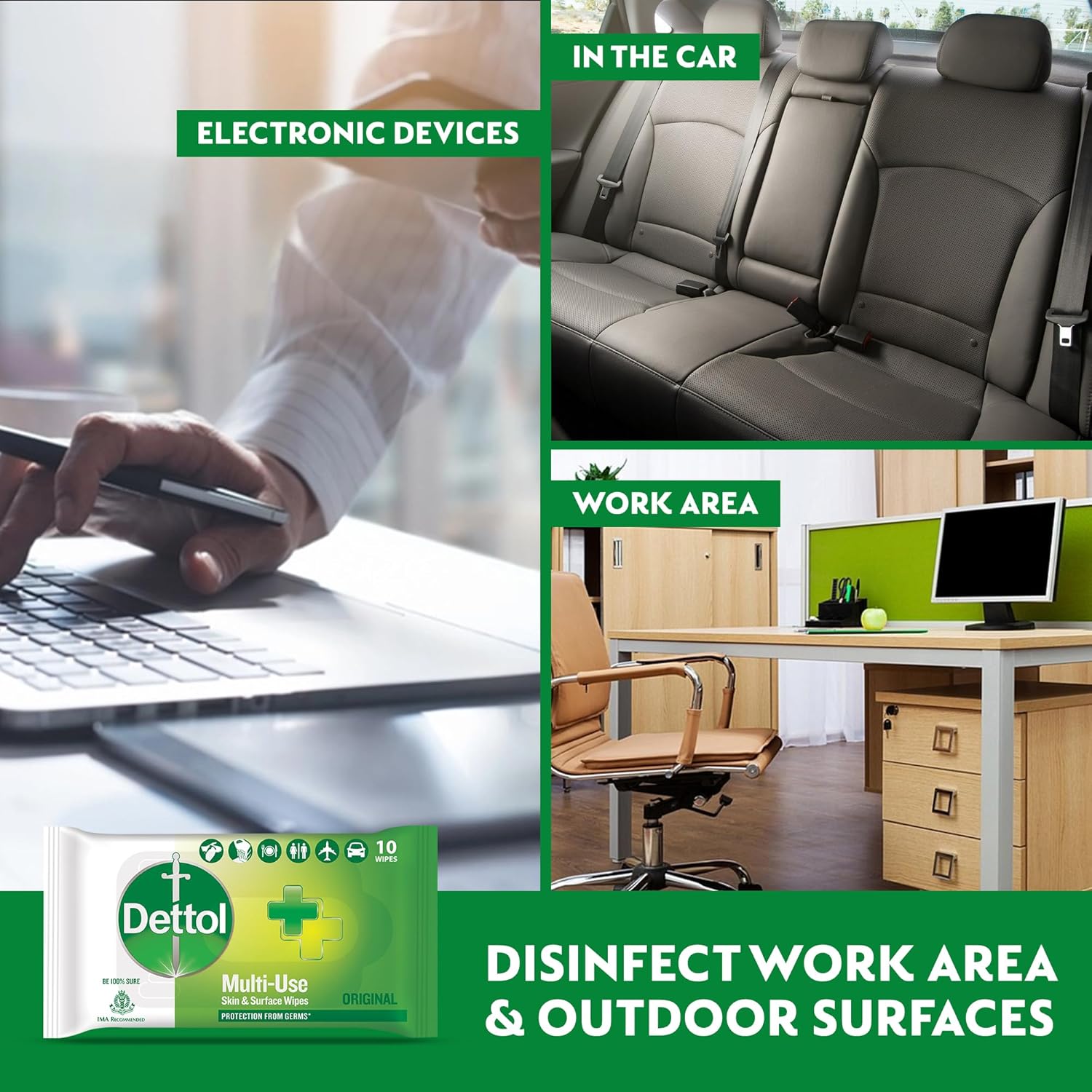 Dettol’s Disinfecting Skin & Surface Wipes are Safe on Skin, Ideal to Clean Multiple Surfaces, Easy to carry with a resealable Moisture-lock lid. Dettol disinfecting wipes are practical for everyday use on furniture, taps, sinks, door knobs, kitchen, bathroom surfaces, floor cleaning, children’s surfaces and places that are germ hotspots. It can be used on most hard, non-porous surfaces including Finished Wood, Sealed Marble, Stainless Steel, Laminated Floors, Glass and Plastic.