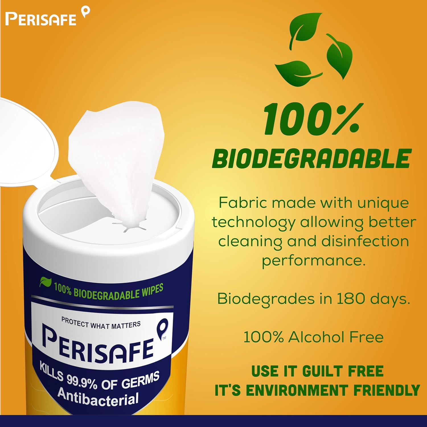 Biodegradable : 100 % Biodegradable wipes. Taking care of earth and next generation.