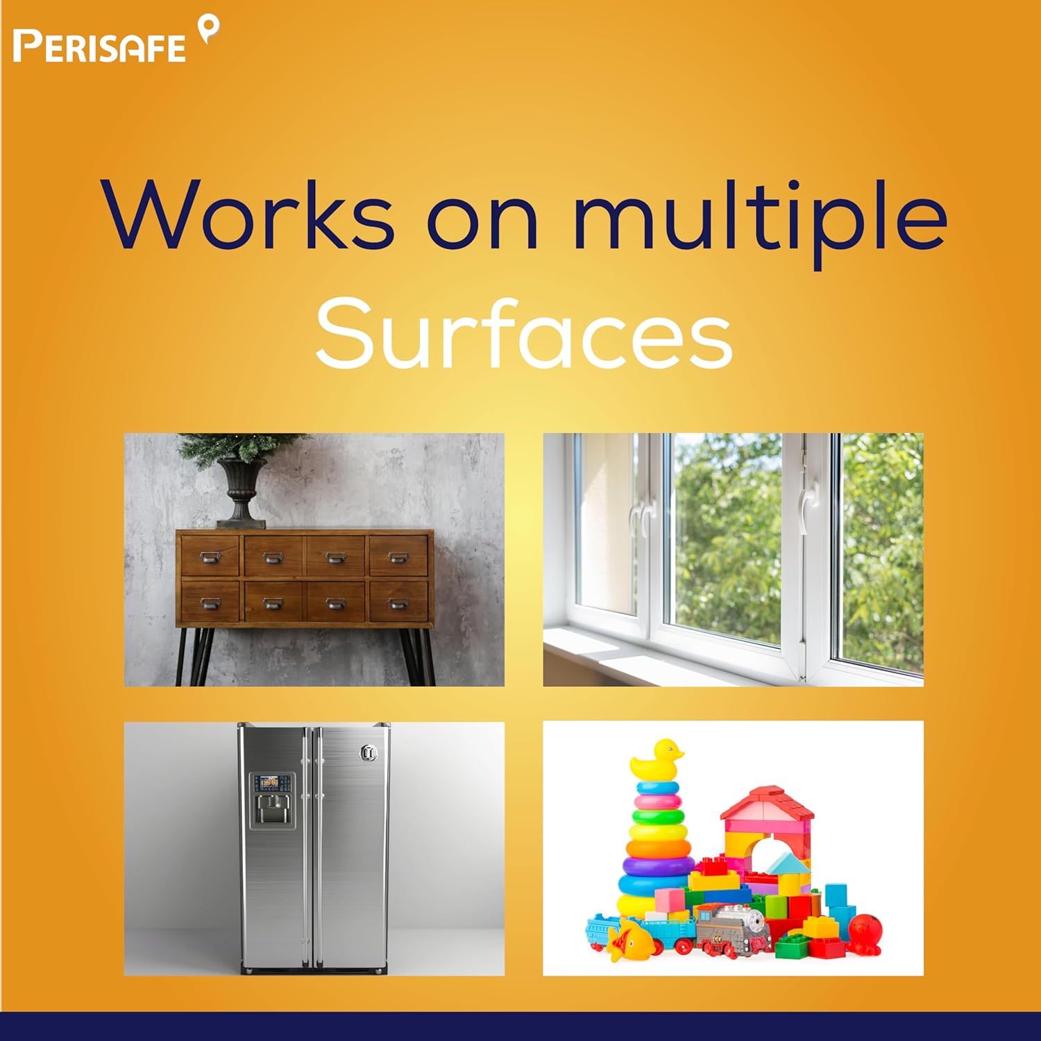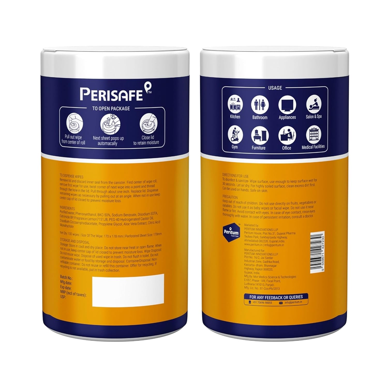 Perisafe Multipurpose Disinfectant wipes are specially formulated alcohol free disinfectant wipes for hard surfaces and soft surfaces like skin. Perisafe’s unique 2-IN-1 formulation kills external germs and clean tough messes at one go, removes bad odour and provides pleasant fresh citrus fragrance. With 100% Biodegradable wipes you don’t feel guilty about using wipes for day to day cleaning and disinfection. Uses : Home, Office, Classroom, Gym, Hotels, Salon & spa, Bathroom, Mirror, Furniture, Hospital, Medical facilities etc