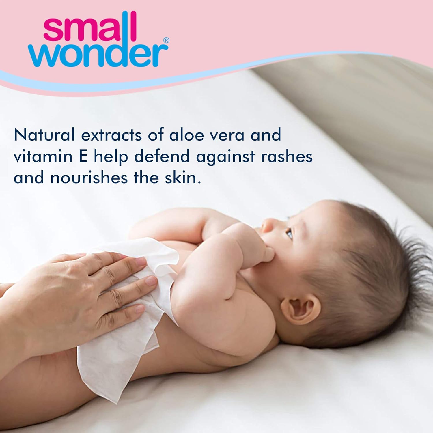 ORGANIC ALOE VERA: This amino-acid enriched gel help reduce flakiness & itching along with moisturizing the skin.VITAMIN E: Deeply nourishes and hydrates the skin. Helps in reducing inflammation and skin damage.Small Wonder Skin Care Baby Wipes are made of a spun lace, non-woven fabric, and are also free of alcohol, making them safe and ideal for use on babiesANTI-BACTERIAL & WATER BASED: Baby Wipes are 98% water-based wipes and are free from alcohol and other harmful substances. They keep your & your baby’s skin free from bacteria.